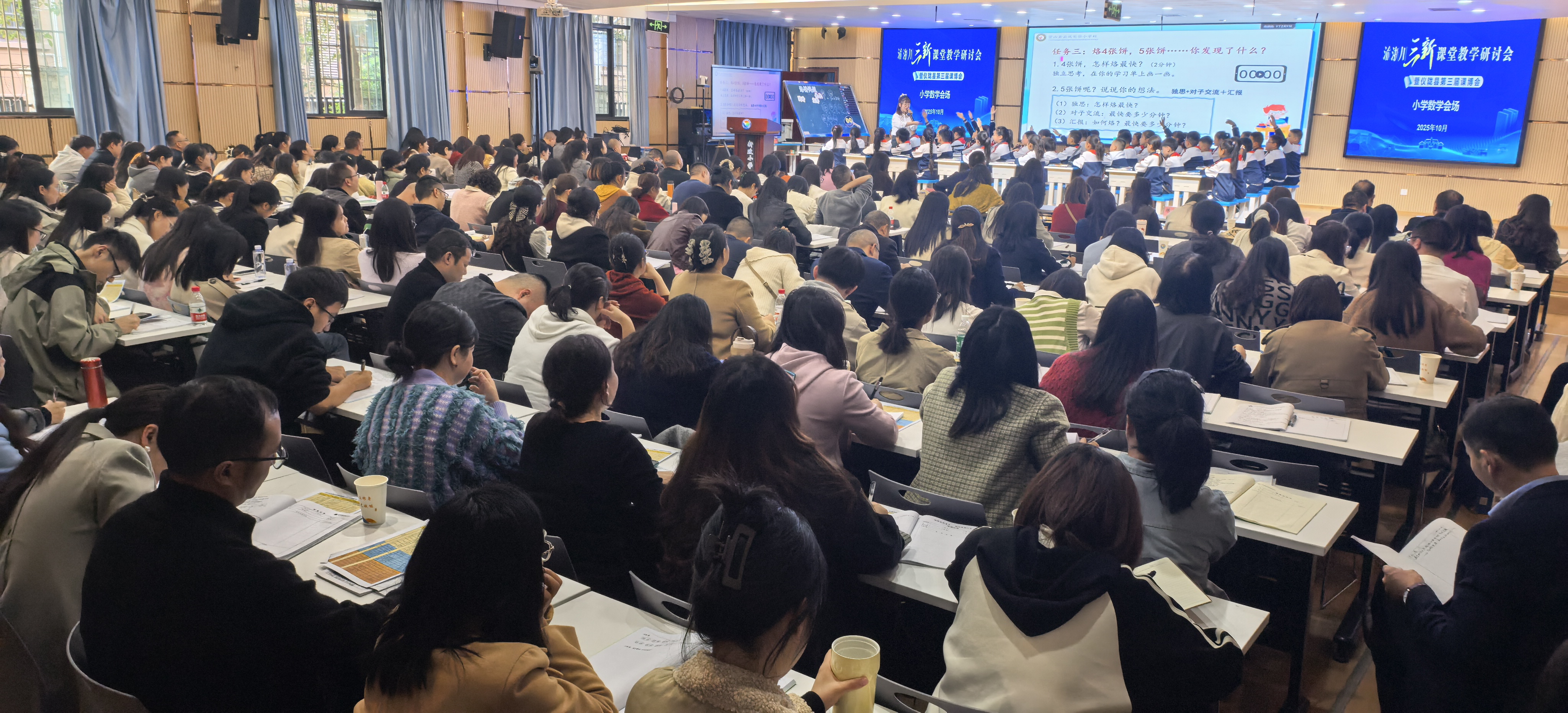 “学术报告厅只有200个座位,老师们不断进来,凳子加了又加。”10月27日16时,新政小学学术报告厅内座无虚席,营山云凤实验小学教师陈小兰正在为四年级学生讲授“烙饼问题”,课堂热度远超该校副校长袁丽蓉预期,“若明天依旧火爆,不少老师只能通过直播参与,现场场地实在有限。”据悉,该课程同步开启线上直播,仪陇本地教师还可通过仪教资源平台观看回放,记者采访时,已有1120名本地教师在线观摩陈小兰老师这堂课。